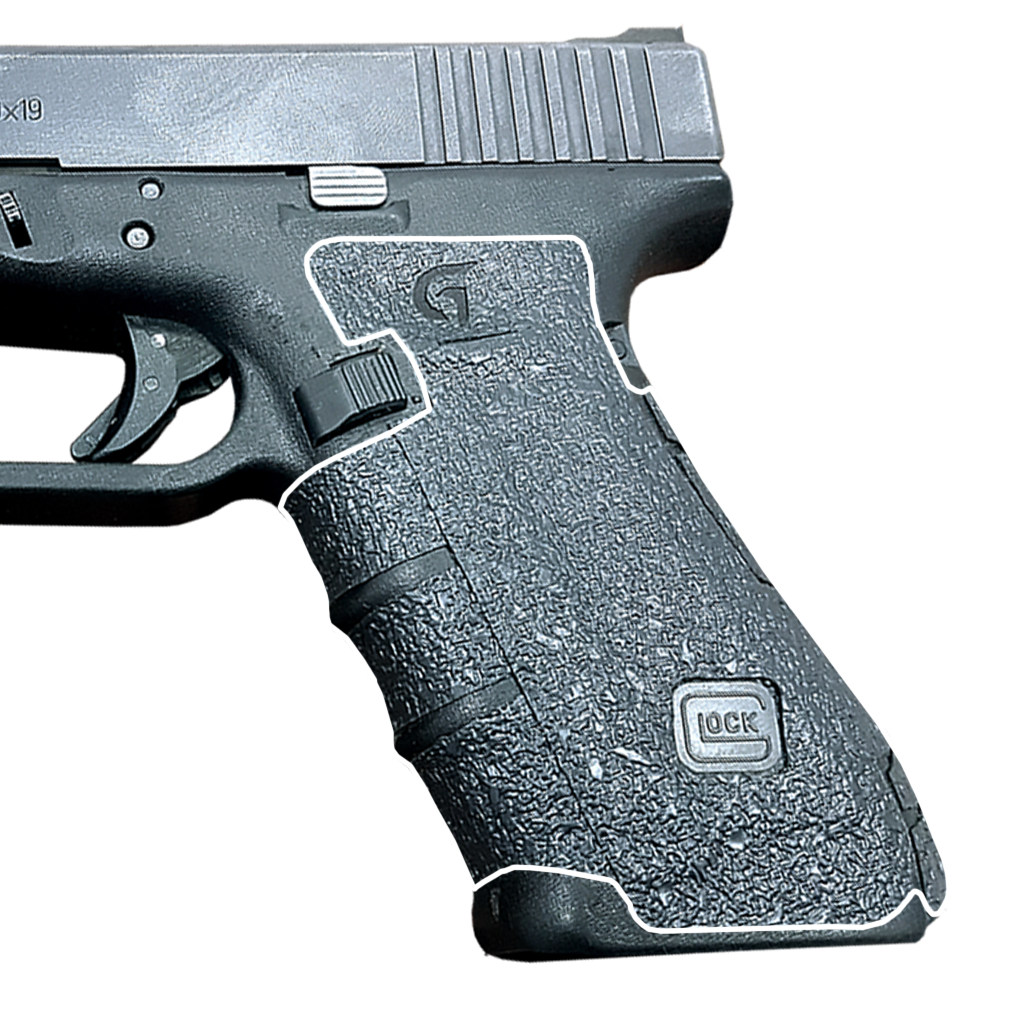 Custom designed from each selected fire-arm to increase maximum grip strength with minimal bulk. The design wraps around the grip in full to provide maximum coverage.
